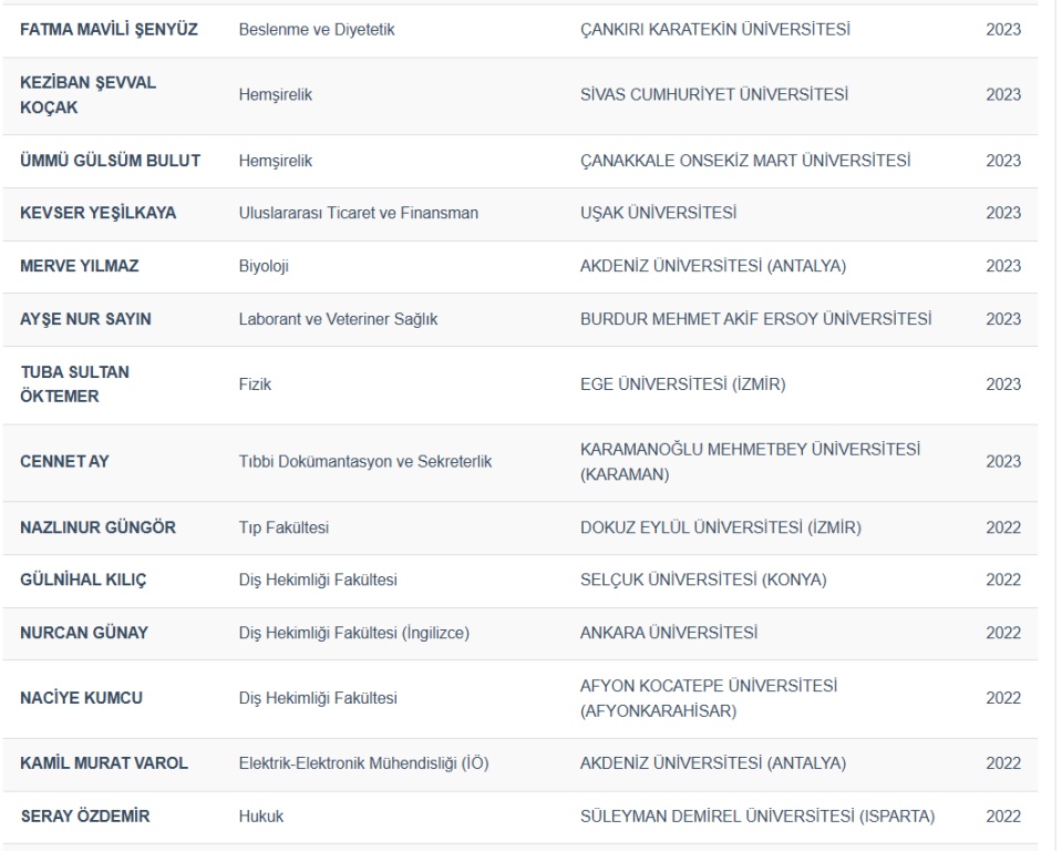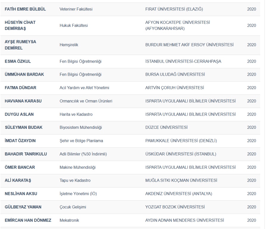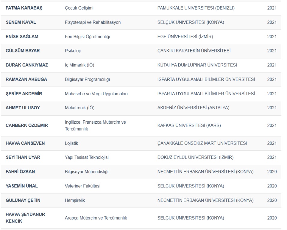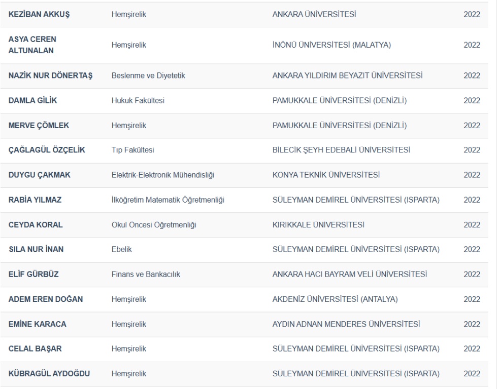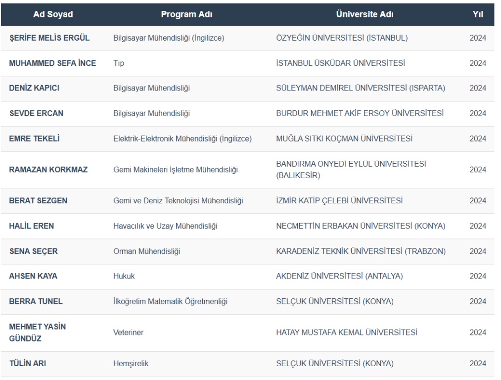 Ad Soyad | Program Adı | Üniversite Adı | Sıralama | Yıl |