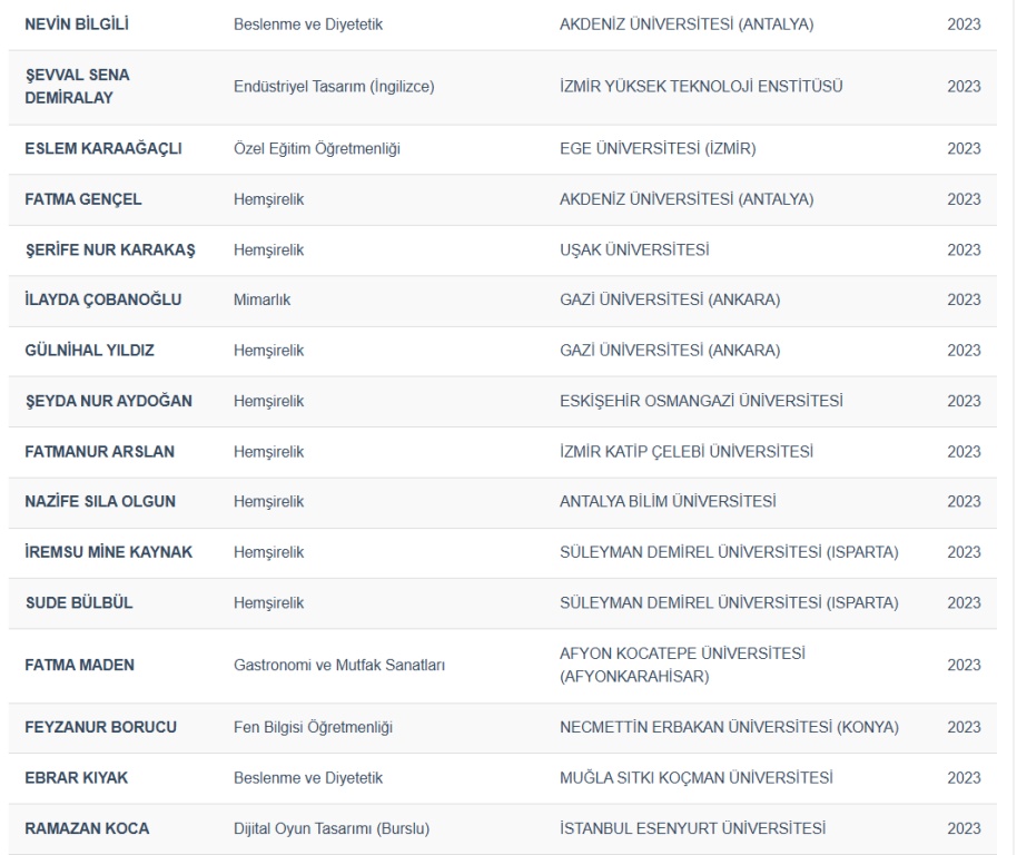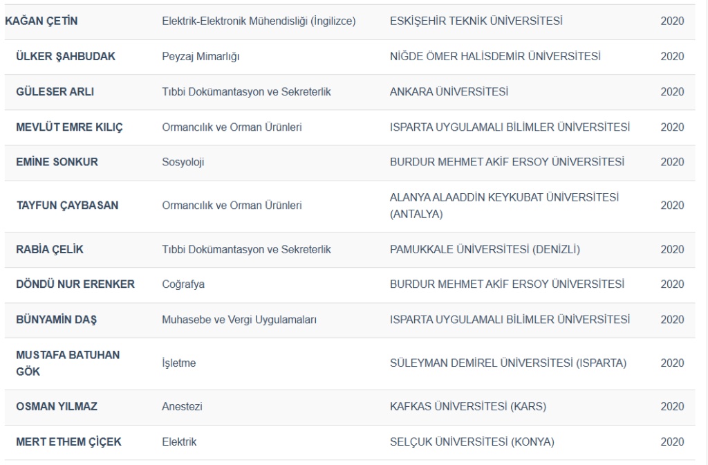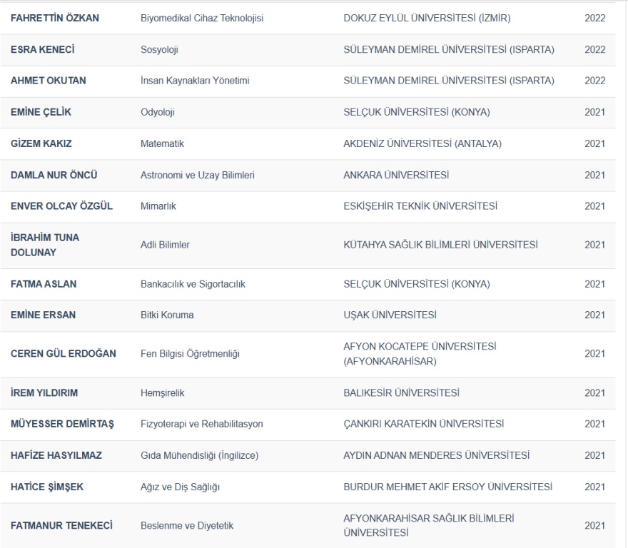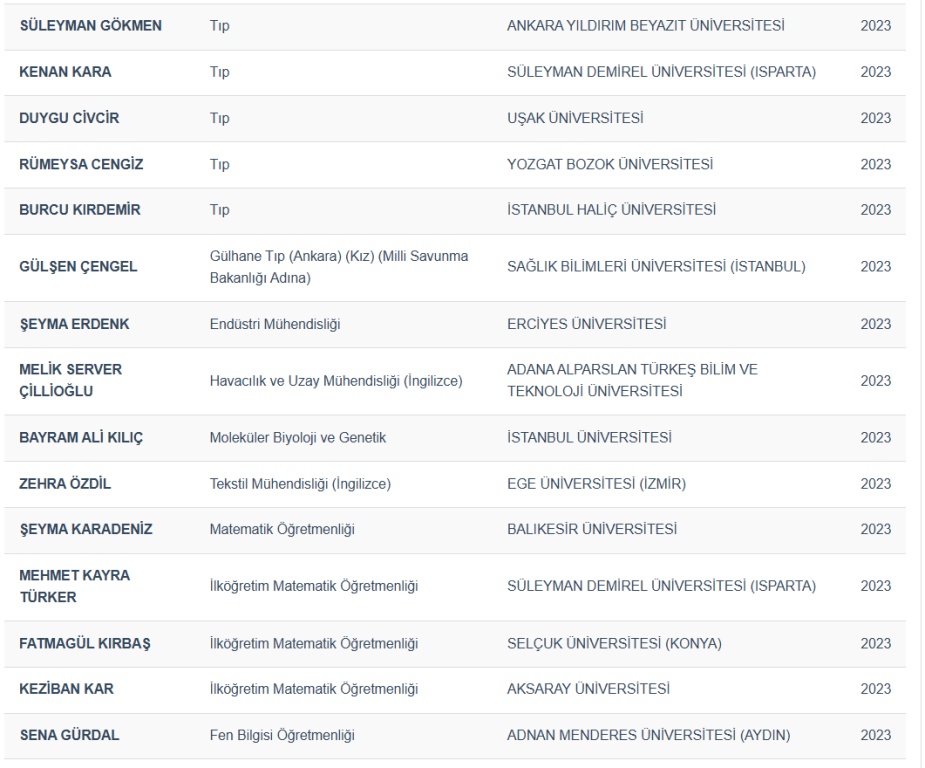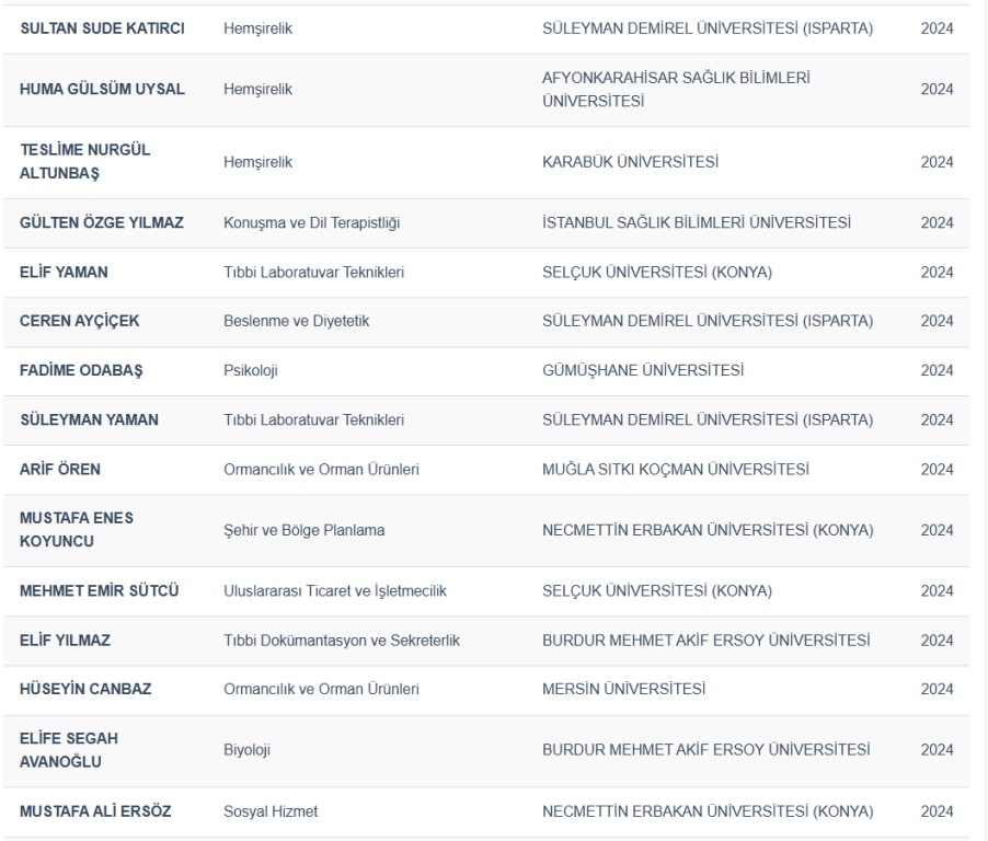 Ad Soyad | Program Adı | Üniversite Adı | Sıralama | Yıl |